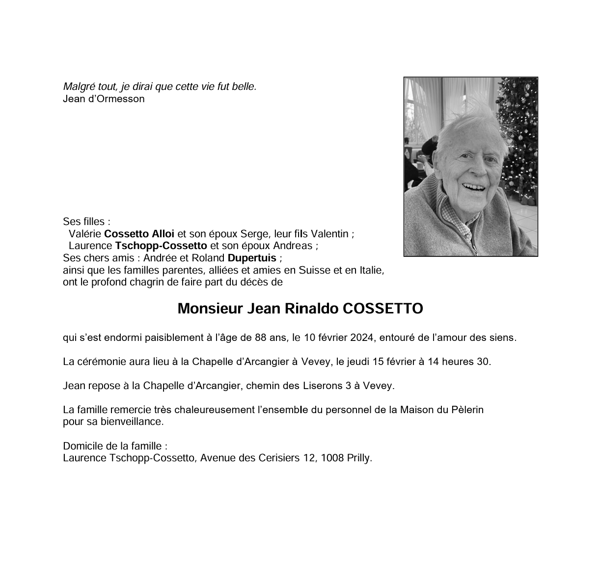 Monsieur Jean Rinaldo COSSETTO 17 jan. 1936 - 10 fév. 2024 Avis mortuaire PFG Télecharger PDF Partager sur: Galerie PreviousNext PreviousNext