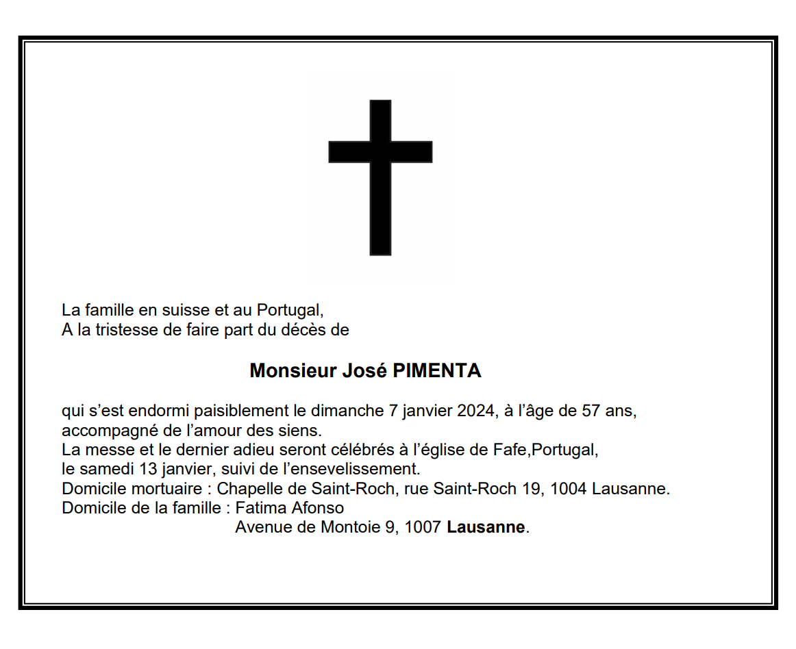 Monsieur José PIMENTA 05 oct. 1966 - 07 jan. 2024 Avis mortuaire PFG Télecharger PDF Partager sur: Galerie PreviousNext PreviousNext