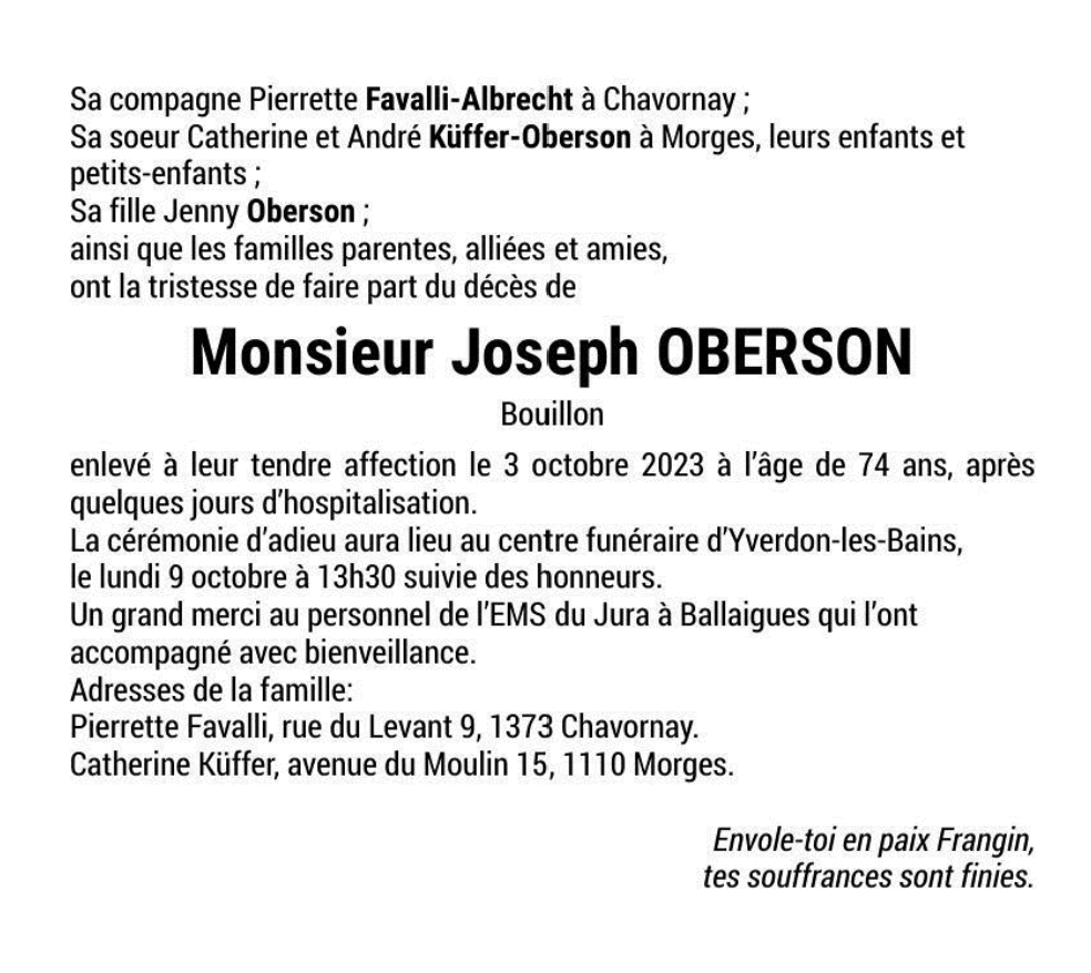 Monsieur Joseph OBERSON 06 avr. 1949 - 03 oct. 2023 Avis mortuaire PFG Télecharger PDF Partager sur: Galerie PreviousNext PreviousNext