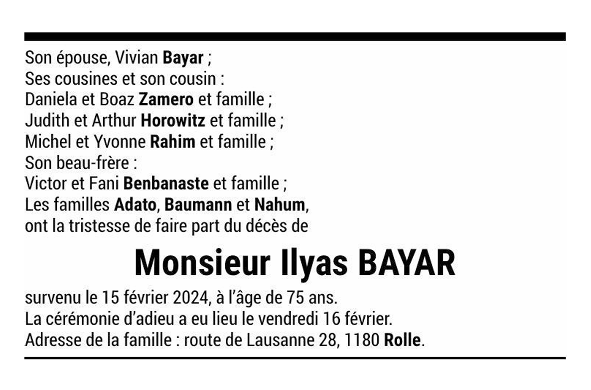 Monsieur Llyas BAYAR 13 fév. 1949 - 15 fév. 2024 Avis mortuaire PFG Télecharger PDF Partager sur: Galerie PreviousNext PreviousNext