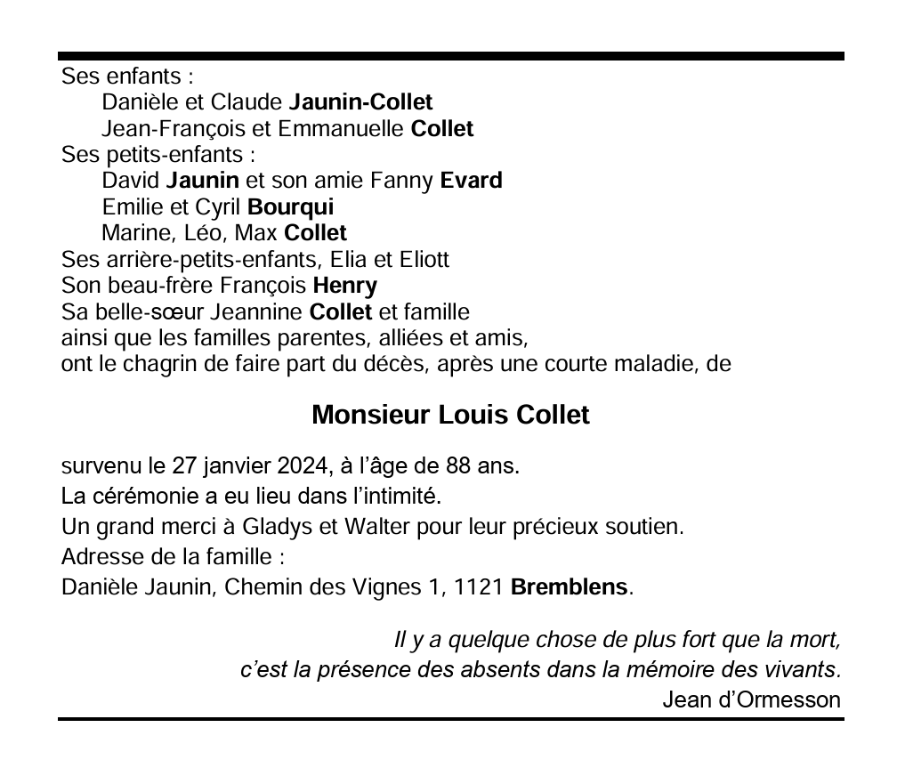 Monsieur Louis Collet 22 sep. 1935 - 27 jan. 2024 Avis mortuaire PFG Télecharger PDF Partager sur: Galerie PreviousNext PreviousNext