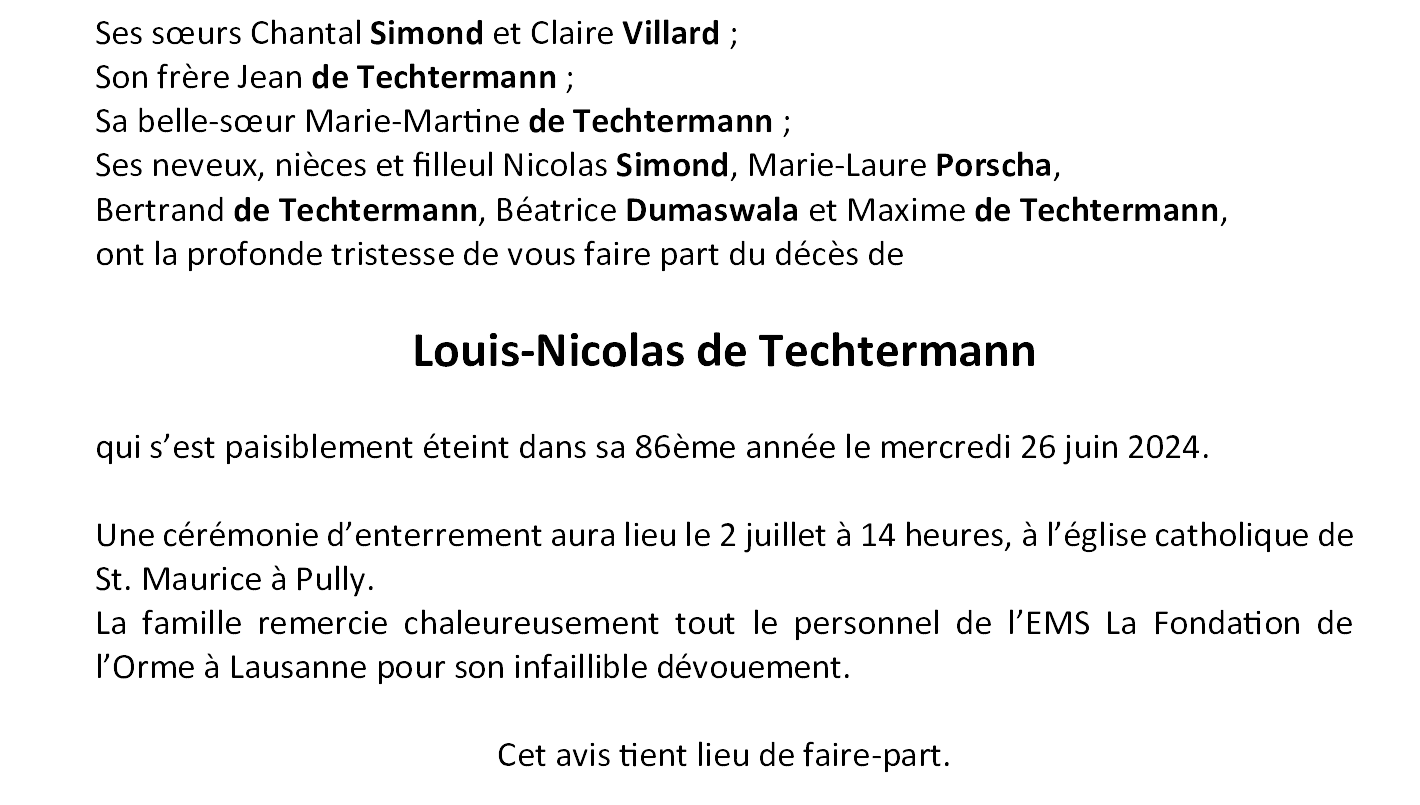 Monsieur Louis-Nicolas de Techtermann 06 déc. 1938 - 26 juin. 2024 Avis mortuaire PFG Partager sur: Galerie