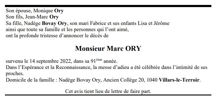 Monsieur Marc ORY 05 juil. 1932 - 14 sep. 2022 Avis mortuaire PFG Télecharger PDF Partager sur: Galerie PreviousNext PreviousNext