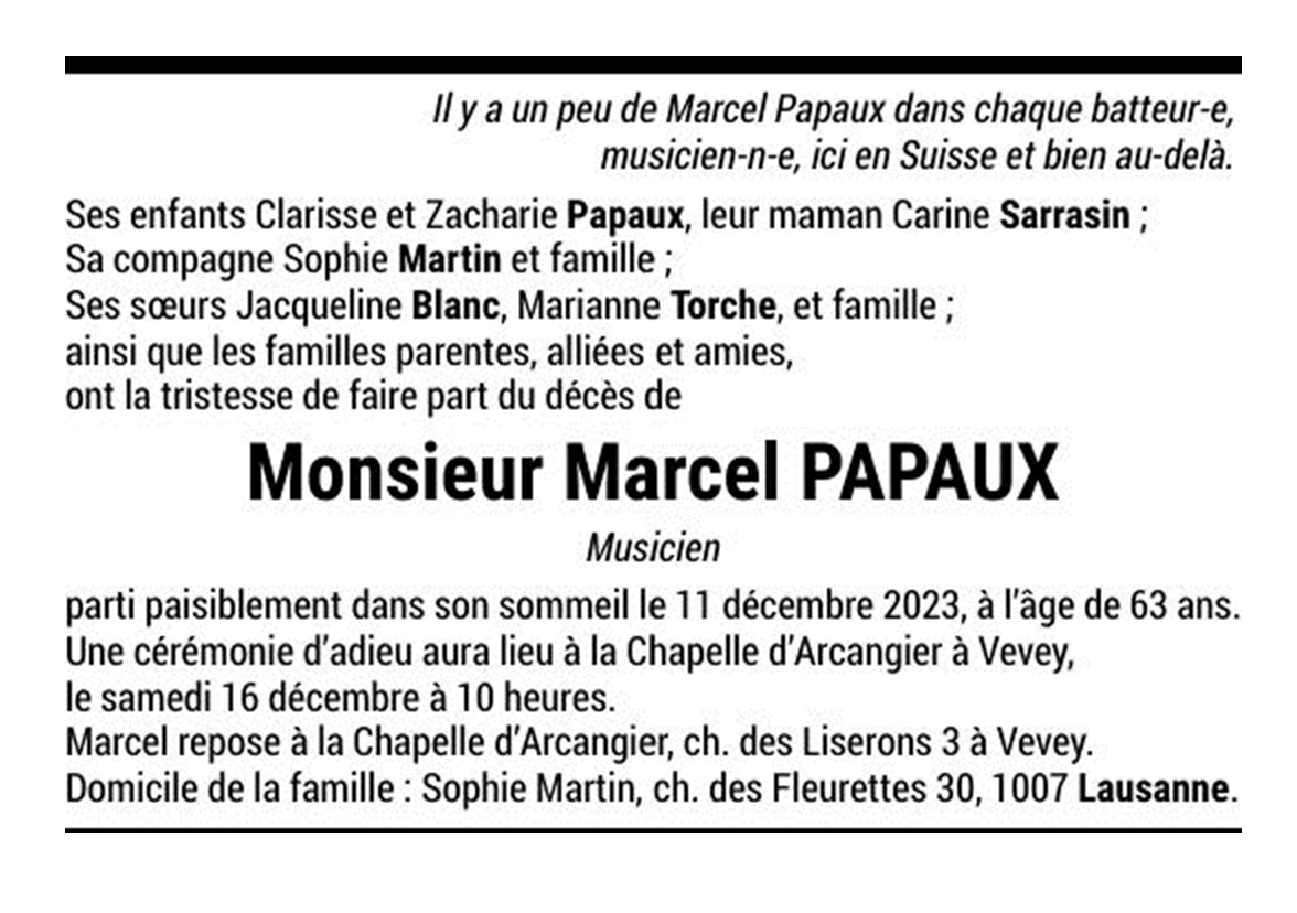 Monsieur Marcel PAPAUX, musicien 31 oct. 1960 - 11 déc. 2023 Avis mortuaire PFG Télecharger PDF Partager sur: Galerie PreviousNext PreviousNext