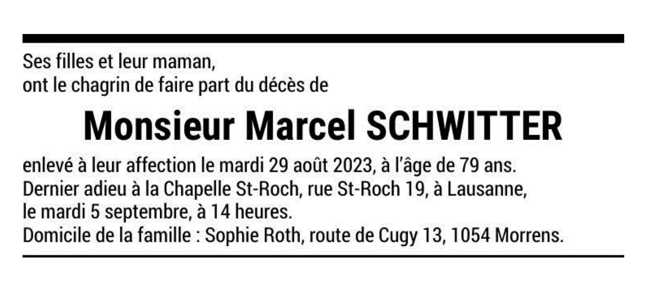 Monsieur Marcel SCHWITTER 19 fév. 1944 - 29 aoû. 2023 Avis mortuaire PFG Télecharger PDF Partager sur: Galerie PreviousNext PreviousNext