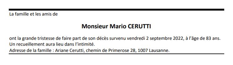 Monsieur Mario CERUTTI 14 sep. 1939 - 02 sep. 2022 Avis mortuaire PFG Télecharger PDF Partager sur: Galerie PreviousNext PreviousNext