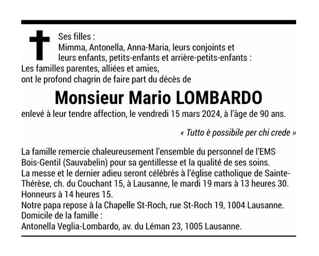Monsieur Mario LOMBARDO 26 jan. 1934 - 15 mar. 2024 Avis mortuaire PFG Télecharger PDF Partager sur: Galerie PreviousNext PreviousNext