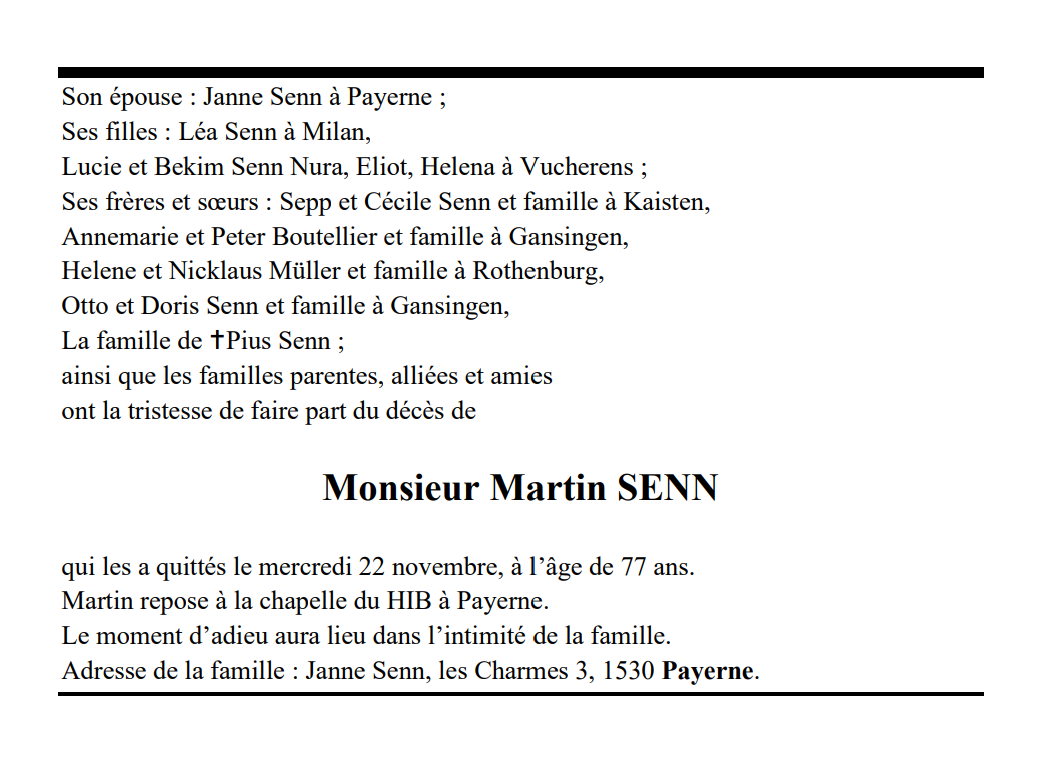 Monsieur Martin SENN 21 avr. 1946 - 22 nov. 2023 Avis mortuaire PFG Télecharger PDF Partager sur: Galerie