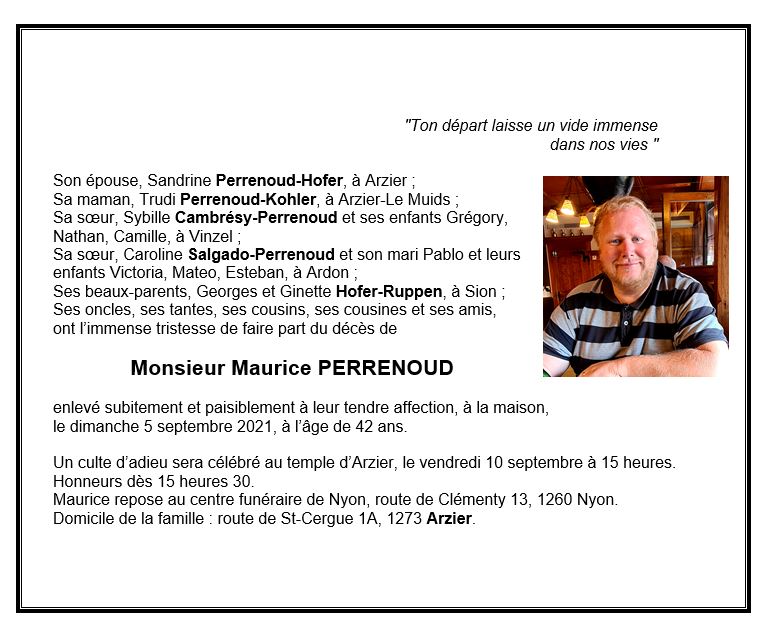 Monsieur Maurice PERRENOUD 13 avr. 1979 - 05 sep. 2021 Avis mortuaire PFG Télecharger PDF Partager sur: Galerie PreviousNext PreviousNext