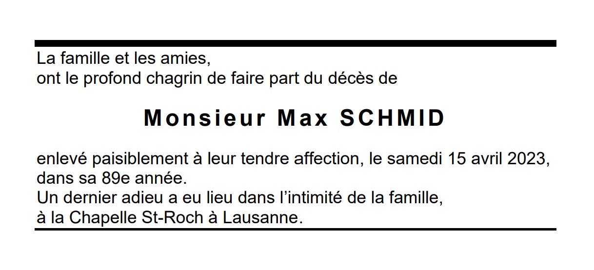 Monsieur Max SCHMID 20 juil. 1934 - 15 avr. 2023 Avis mortuaire PFG Télecharger PDF Partager sur: Galerie PreviousNext PreviousNext