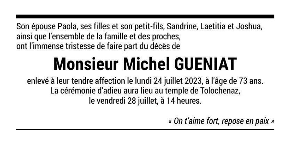 Monsieur Michel GUENIAT 01 mai. 1950 - 24 juil. 2023 Avis mortuaire PFG Télecharger PDF Partager sur: Galerie PreviousNext PreviousNext