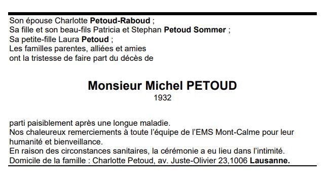 Monsieur Michel PETOUD 23 déc. 1932 - 05 déc. 2021 Avis mortuaire PFG Télecharger PDF Partager sur: Galerie PreviousNext PreviousNext