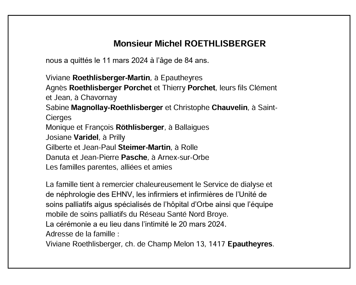 Monsieur Michel ROETHLISBERGER 10 mar. 1940 - 11 mar. 2024 Avis mortuaire PFG Télecharger PDF Partager sur: Galerie