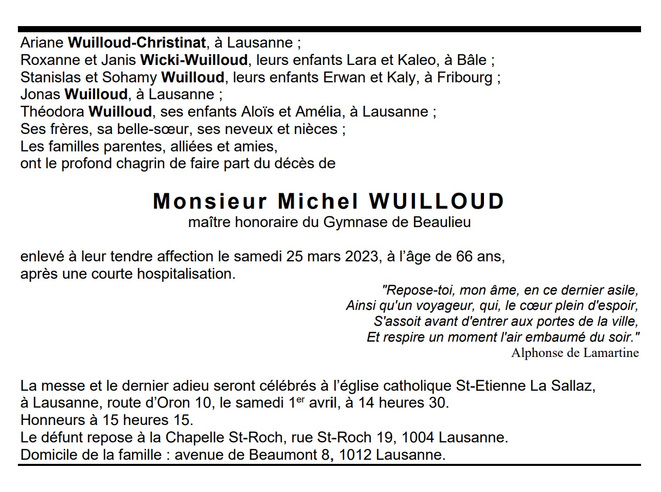 Monsieur Michel WUILLOUD 20 fév. 1957 - 25 mar. 2023 Avis mortuaire PFG Télecharger PDF Partager sur: Galerie PreviousNext PreviousNext