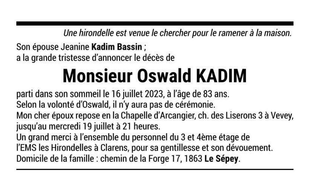 Monsieur Oswald KADIM 14 aoû. 1940 - 16 juil. 2023 Avis mortuaire PFG Télecharger PDF Partager sur: Galerie PreviousNext PreviousNext
