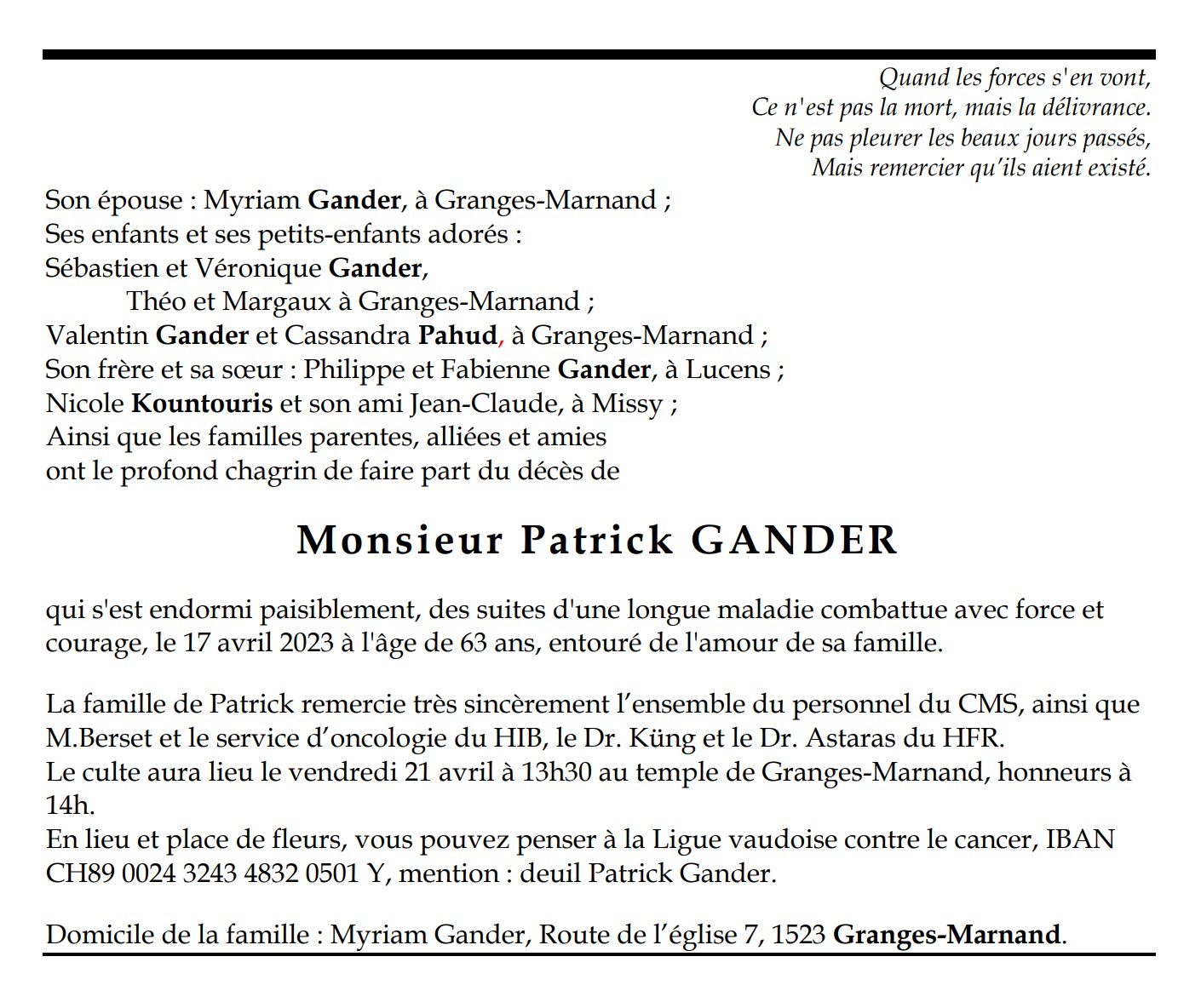 Monsieur Patrick GANDER 05 fév. 1960 - 17 avr. 2023 Avis mortuaire PFG Télecharger PDF Partager sur: Galerie PreviousNext PreviousNext