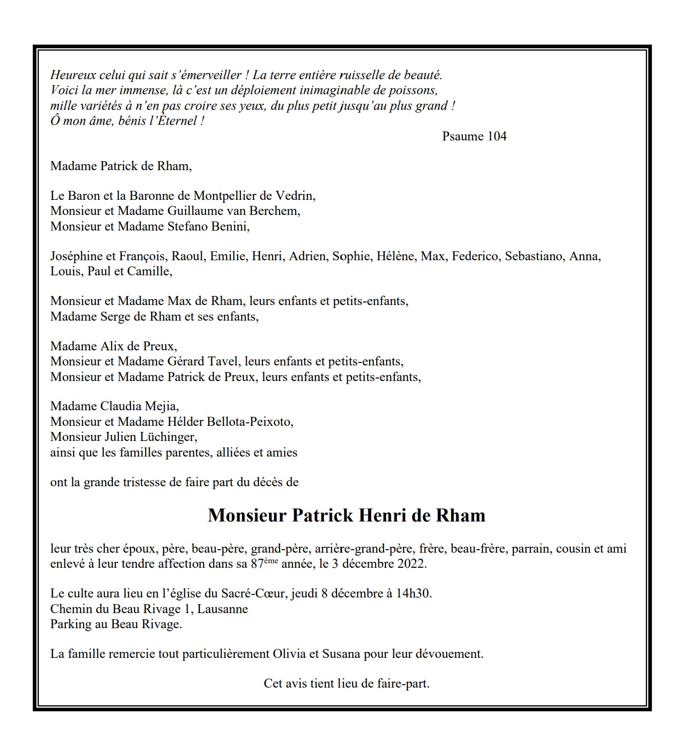 Monsieur Patrick Henri de Rham 15 avr. 1936 - 03 déc. 2022 Avis mortuaire PFG Télecharger PDF Partager sur: Galerie PreviousNext PreviousNext