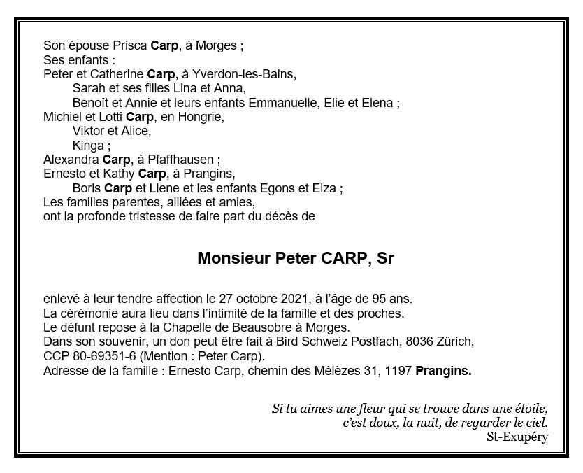 Monsieur Peter CARP, Sr 07 mar. 1926 - 27 oct. 2021 Avis mortuaire PFG Télecharger PDF Partager sur: Galerie PreviousNext PreviousNext