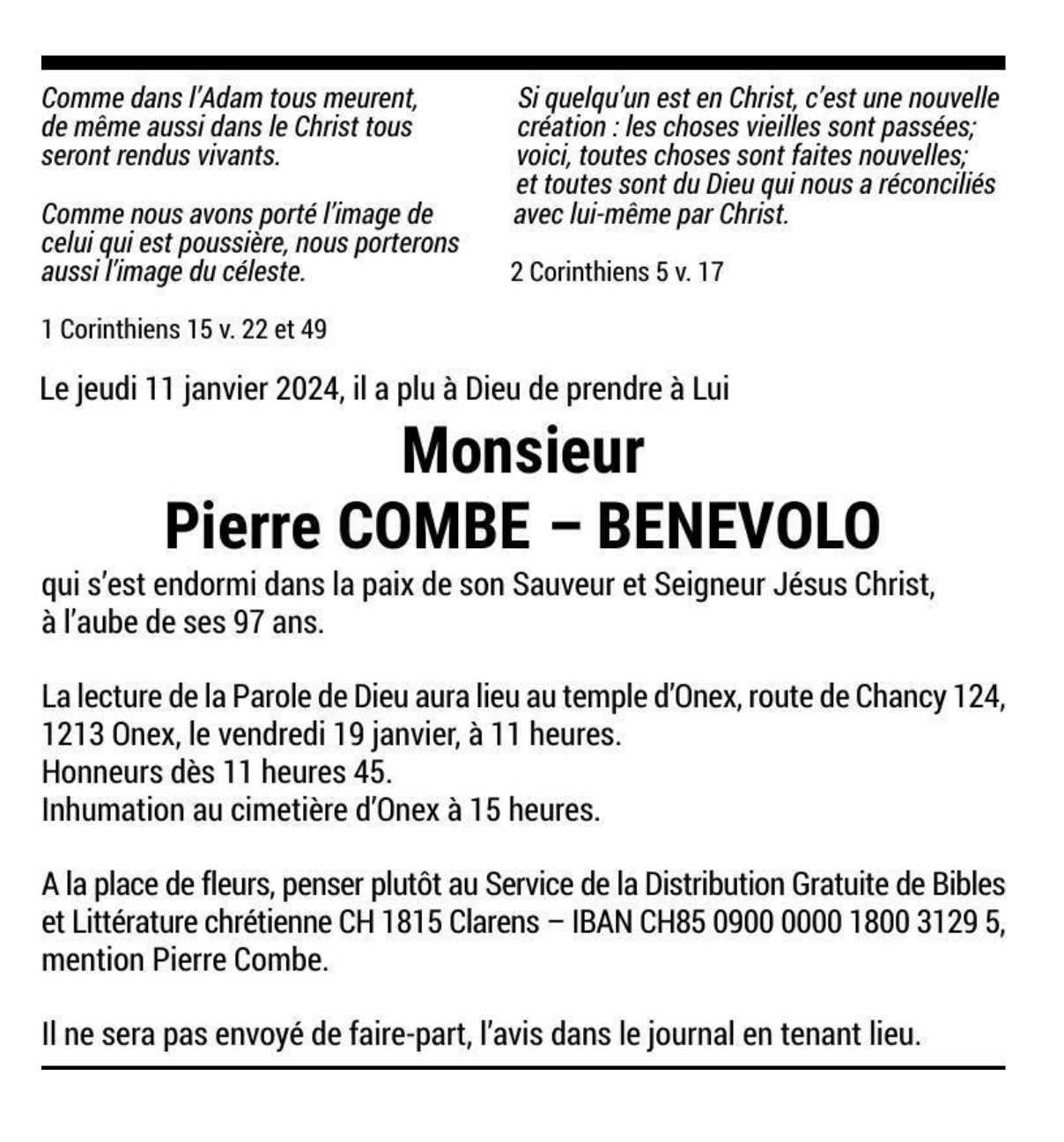 Monsieur Pierre COMBE - BENEVOLO 07 fév. 1927 - 11 jan. 2024 Avis mortuaire PFG Télecharger PDF Partager sur: Galerie PreviousNext PreviousNext