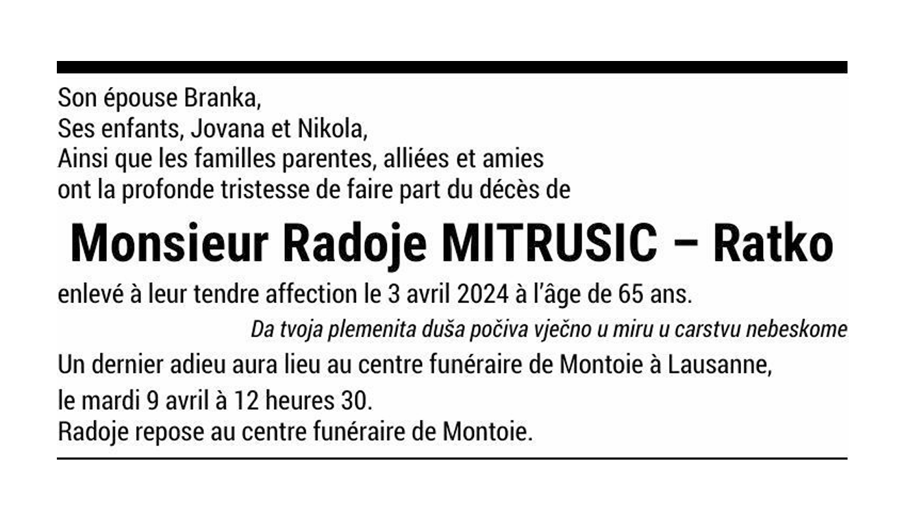 Monsieur Radoje MITRUSIC - Ratko 24 fév. 1959 - 03 avr. 2024 Avis mortuaire PFG Télecharger PDF Partager sur: Galerie PreviousNext PreviousNext