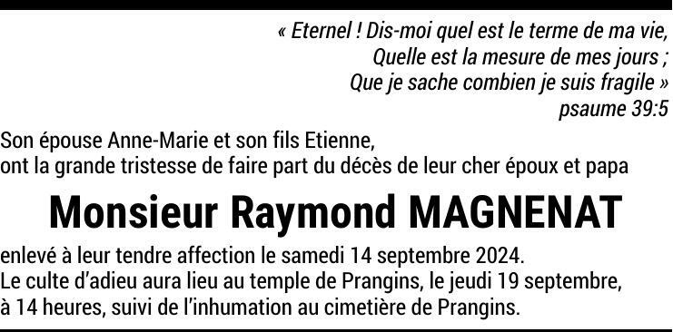Monsieur Raymond MAGNENAT 26 nov. 1938 - 14 sep. 2024 Avis mortuaire PFG Partager sur: Galerie PreviousNext PreviousNext
