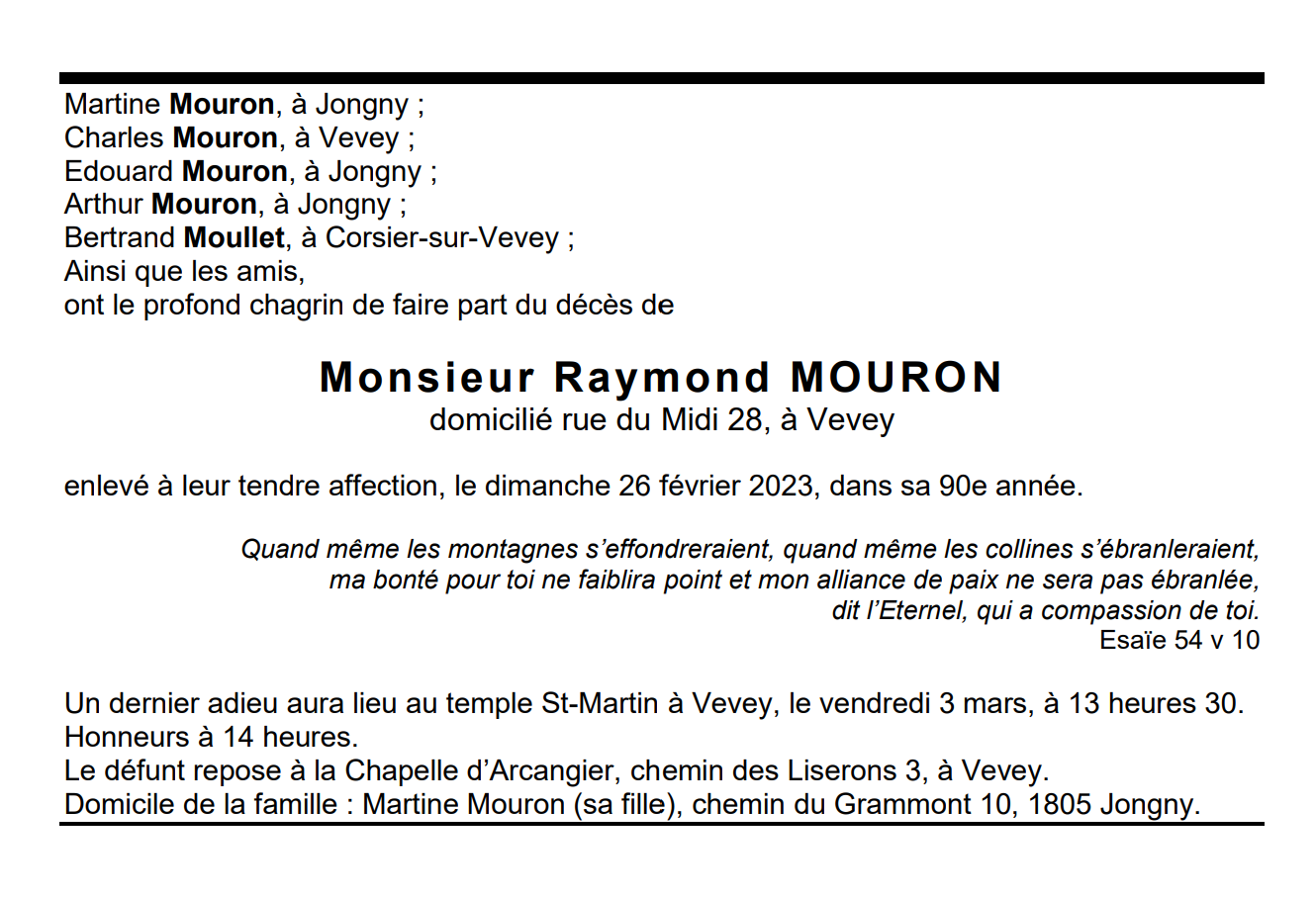 Monsieur Raymond MOURON 04 jan. 1934 - 26 fév. 2023 Avis mortuaire PFG Télecharger PDF Partager sur: Galerie PreviousNext PreviousNext