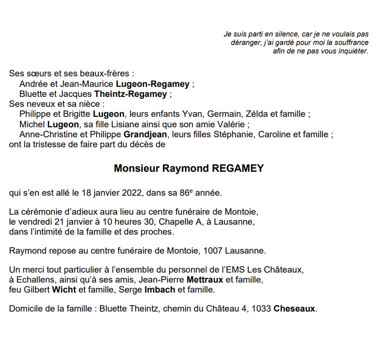 Monsieur Raymond REGAMEY 19 oct. 1936 - 18 jan. 2022 Avis mortuaire PFG Télecharger PDF Partager sur: Galerie PreviousNext PreviousNext