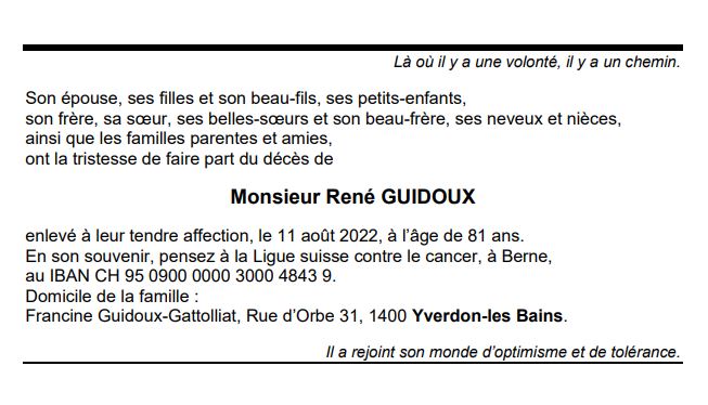 Monsieur René GUIDOUX 16 sep. 1941 - 11 aoû. 2022 Avis mortuaire PFG Télecharger PDF Partager sur: Galerie PreviousNext PreviousNext