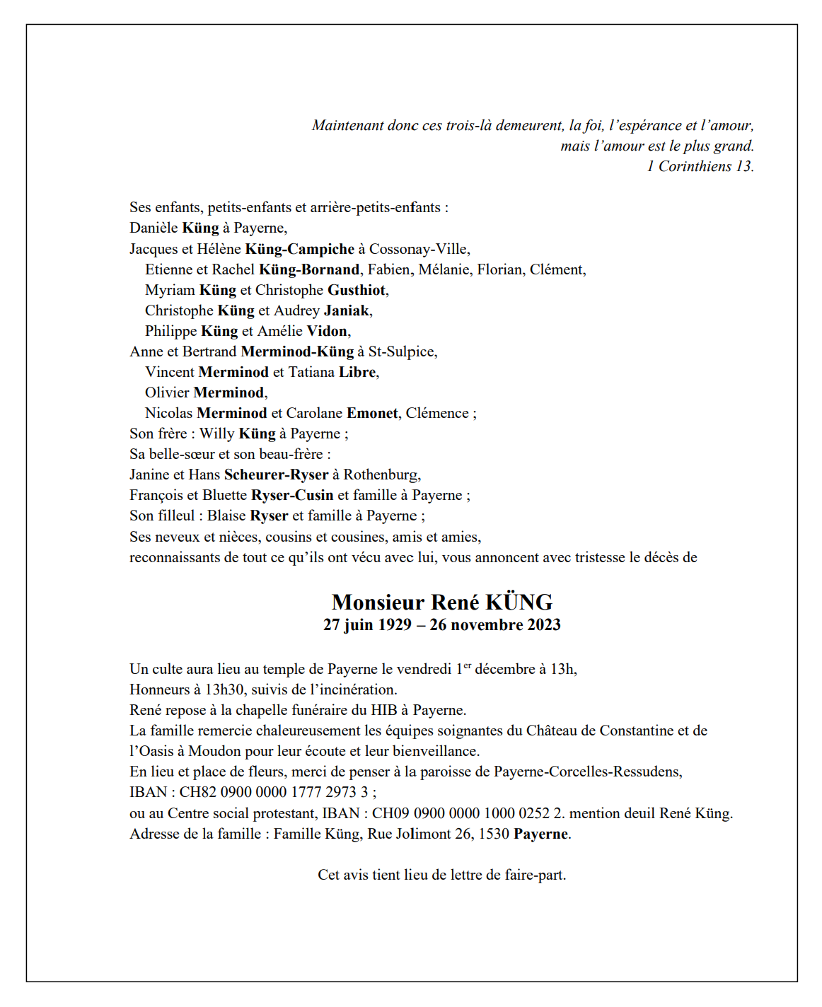 Monsieur René KÜNG 27 juin. 1929 - 26 nov. 2023 Avis mortuaire PFG Télecharger PDF Partager sur: Galerie PreviousNext PreviousNext