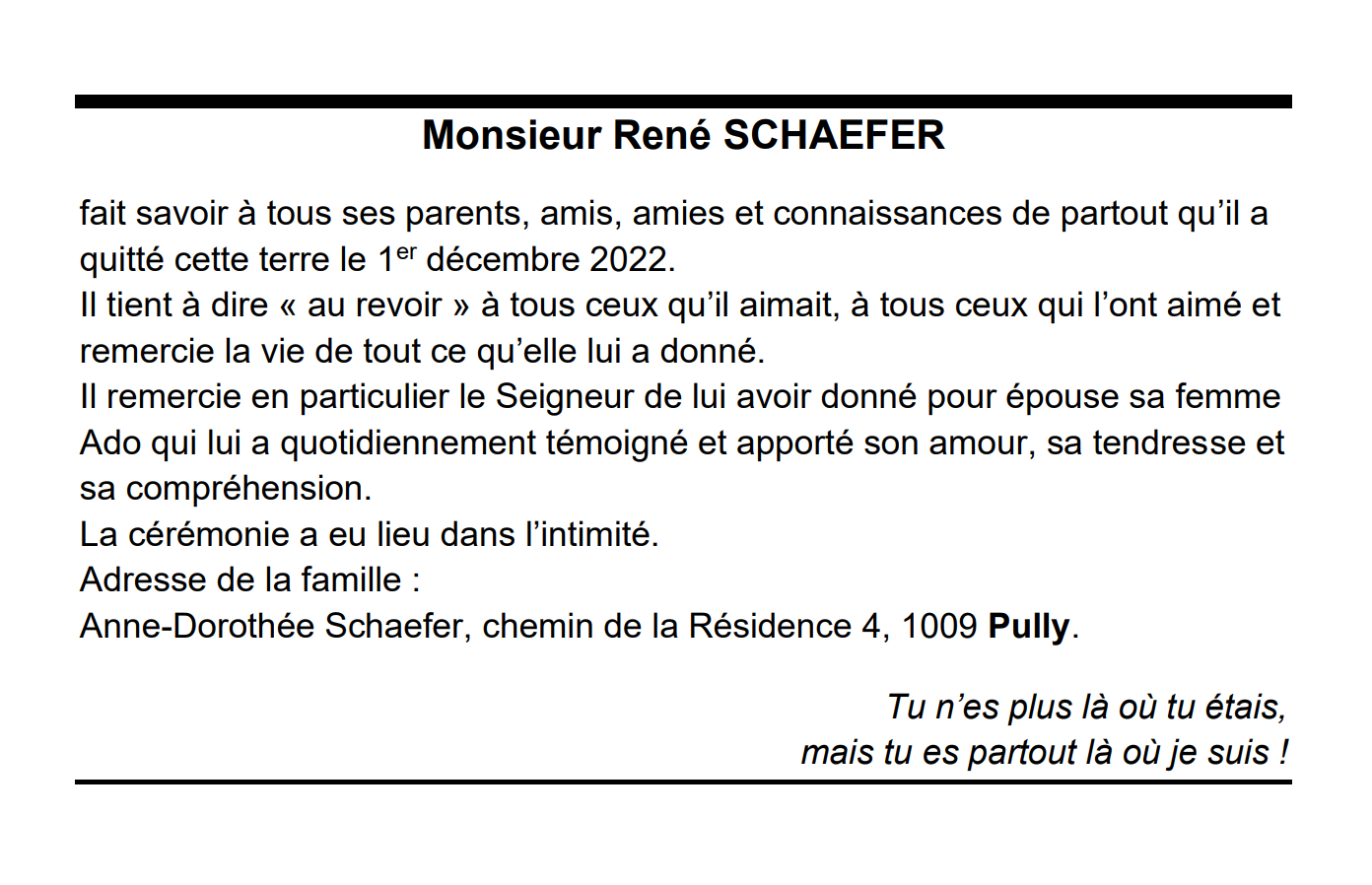 Monsieur René SCHAEFER 13 nov. 1946 - 01 déc. 2022 Avis mortuaire PFG Télecharger PDF Partager sur: Galerie PreviousNext PreviousNext