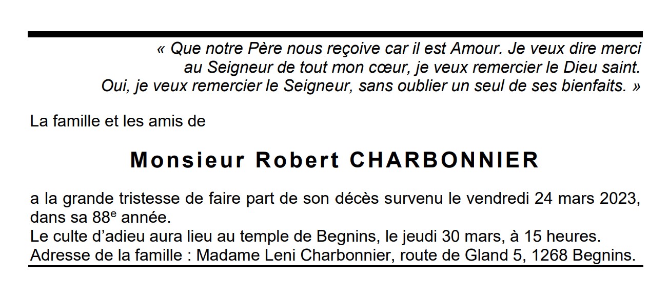 Monsieur Robert CHARBONNIER 19 oct. 1935 - 24 mar. 2023 Avis mortuaire PFG Télecharger PDF Partager sur: Galerie PreviousNext PreviousNext