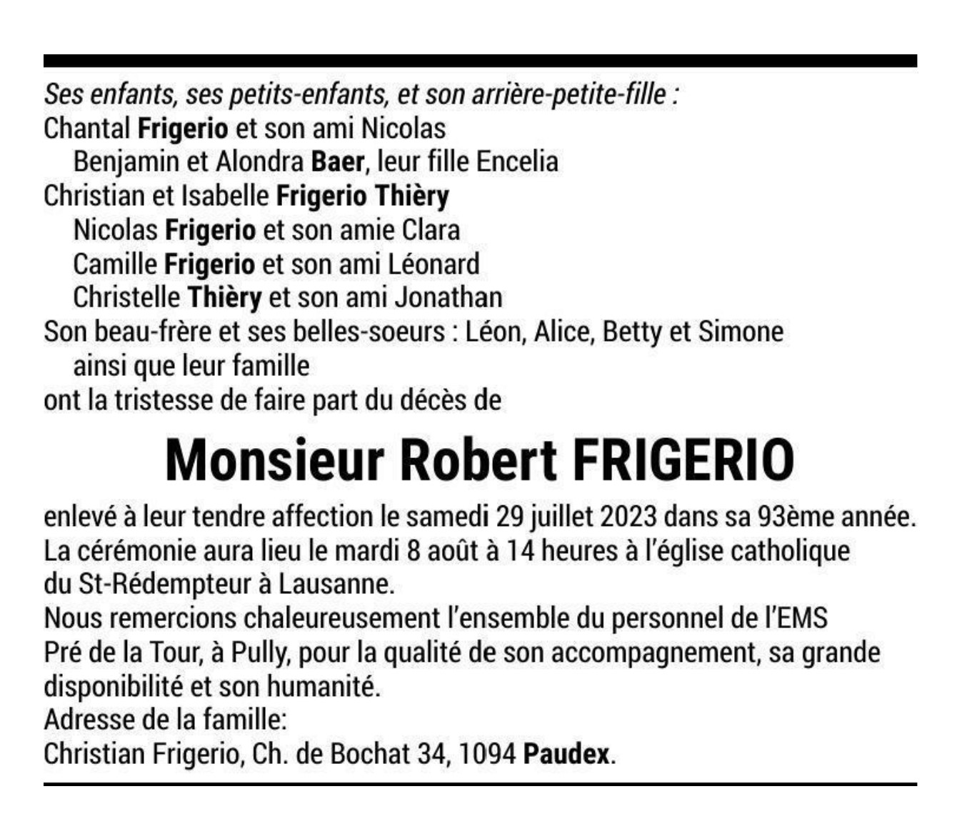 Monsieur Robert FRIGERIO 02 avr. 1931 - 29 juil. 2023 Avis mortuaire PFG Télecharger PDF Partager sur: Galerie PreviousNext PreviousNext