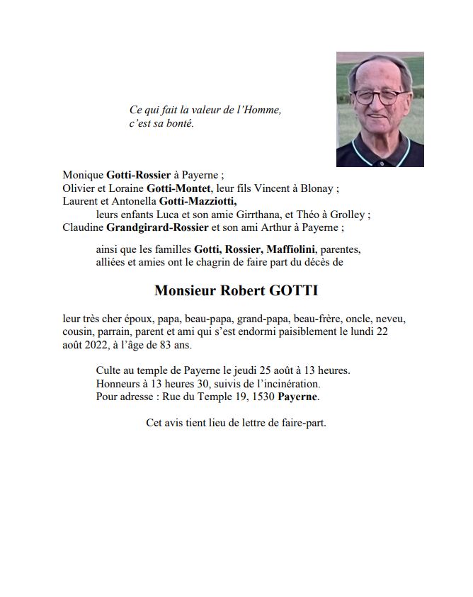Monsieur Robert GOTTI 25 fév. 1939 - 22 aoû. 2022 Avis mortuaire PFG Télecharger PDF Partager sur: Galerie PreviousNext PreviousNext