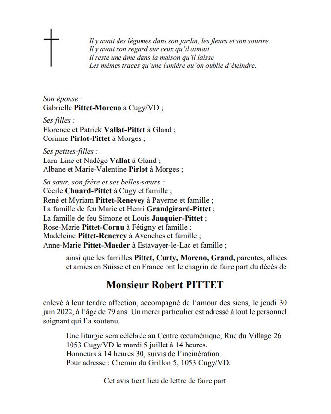 Monsieur Robert PITTET 20 jan. 1943 - 30 juin. 2022 Avis mortuaire PFG Télecharger PDF Partager sur: Galerie
