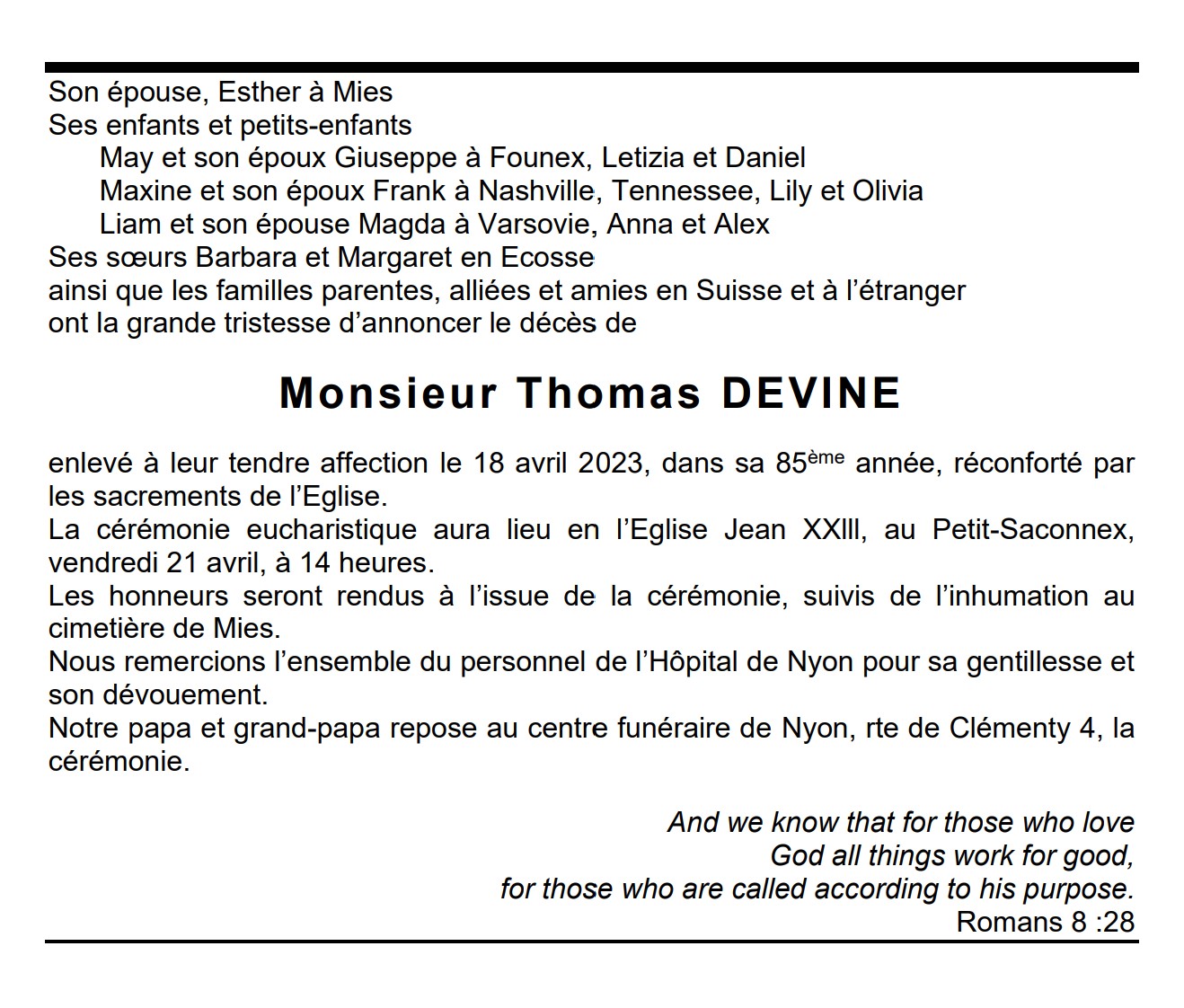 Monsieur Thomas DEVINE 03 déc. 1937 - 18 avr. 2023 Avis mortuaire PFG Télecharger PDF Partager sur: Galerie PreviousNext PreviousNext
