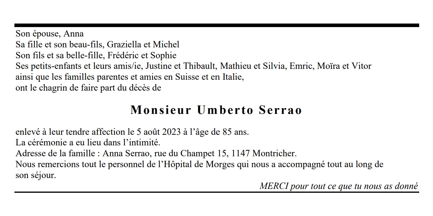 Monsieur Umberto Serrao 01 sep. 1938 - 05 aoû. 2023 Avis mortuaire PFG Télecharger PDF Partager sur: Galerie PreviousNext PreviousNext