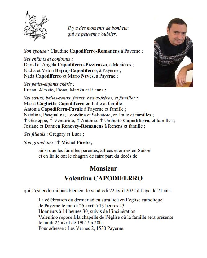 Monsieur Valentino CAPODIFERRO 01 jan. 1951 - 22 avr. 2022 Avis mortuaire PFG Télecharger PDF Partager sur: Galerie PreviousNext PreviousNext