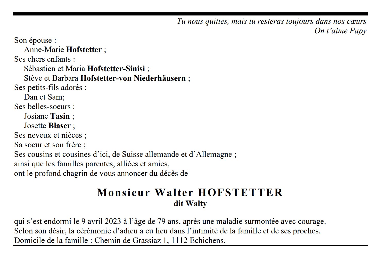 Monsieur Walter HOFSTETTER dit Walty 11 fév. 1944 - 09 avr. 2023 Avis mortuaire PFG Télecharger PDF Partager sur: Galerie PreviousNext PreviousNext