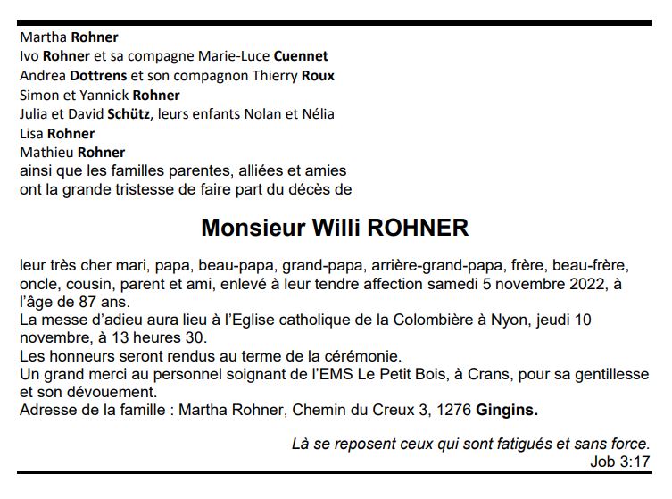 Monsieur Willi ROHNER 04 avr. 1935 - 05 nov. 2022 Avis mortuaire PFG Télecharger PDF Partager sur: Galerie PreviousNext PreviousNext