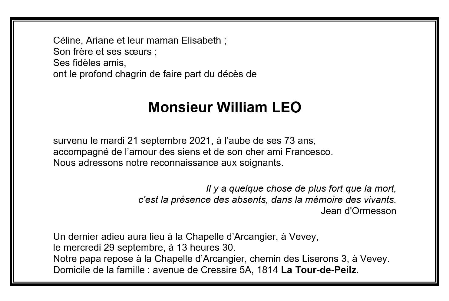 Monsieur William LEO 23 oct. 1948 - 21 sep. 2021 Avis mortuaire PFG Télecharger PDF Partager sur: Galerie PreviousNext PreviousNext