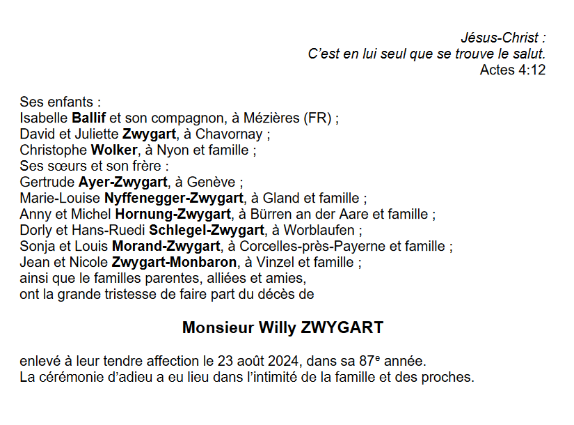 Monsieur Willy ZWYGART 06 jan. 1937 - 23 aoû. 2024 Avis mortuaire PFG Télecharger PDF Partager sur: Galerie