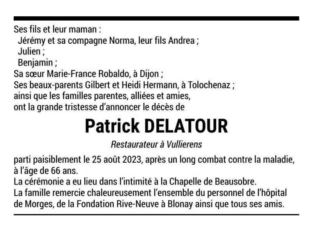 Patrick DELATOUR 13 mai. 1957 - 25 aoû. 2023 Avis mortuaire PFG Télecharger PDF Partager sur: Galerie PreviousNext PreviousNext