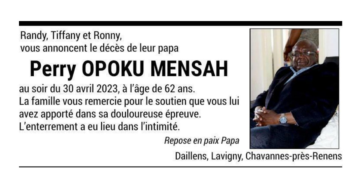 Perry OPOKU MENSAH 15 juin. 1961 - 30 avr. 2023 Avis mortuaire PFG Télecharger PDF Partager sur: Galerie PreviousNext PreviousNext