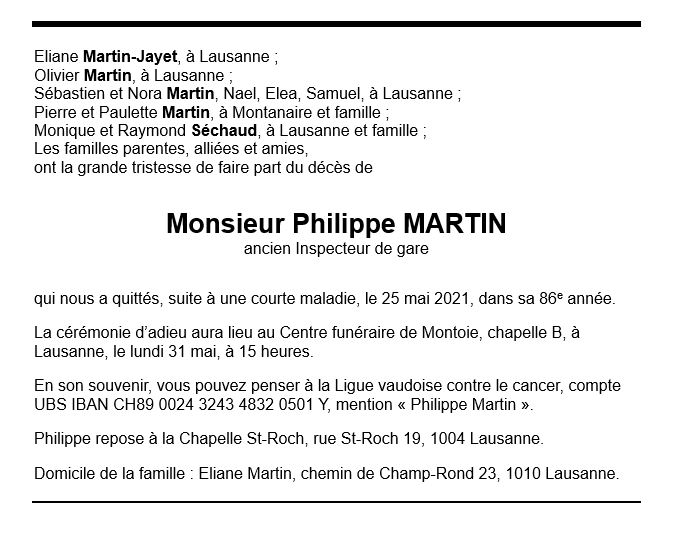 Philippe MARTIN 16 oct. 1935 - 25 mai. 2021 Avis mortuaire PFG Télecharger PDF Partager sur: Galerie PreviousNext PreviousNext