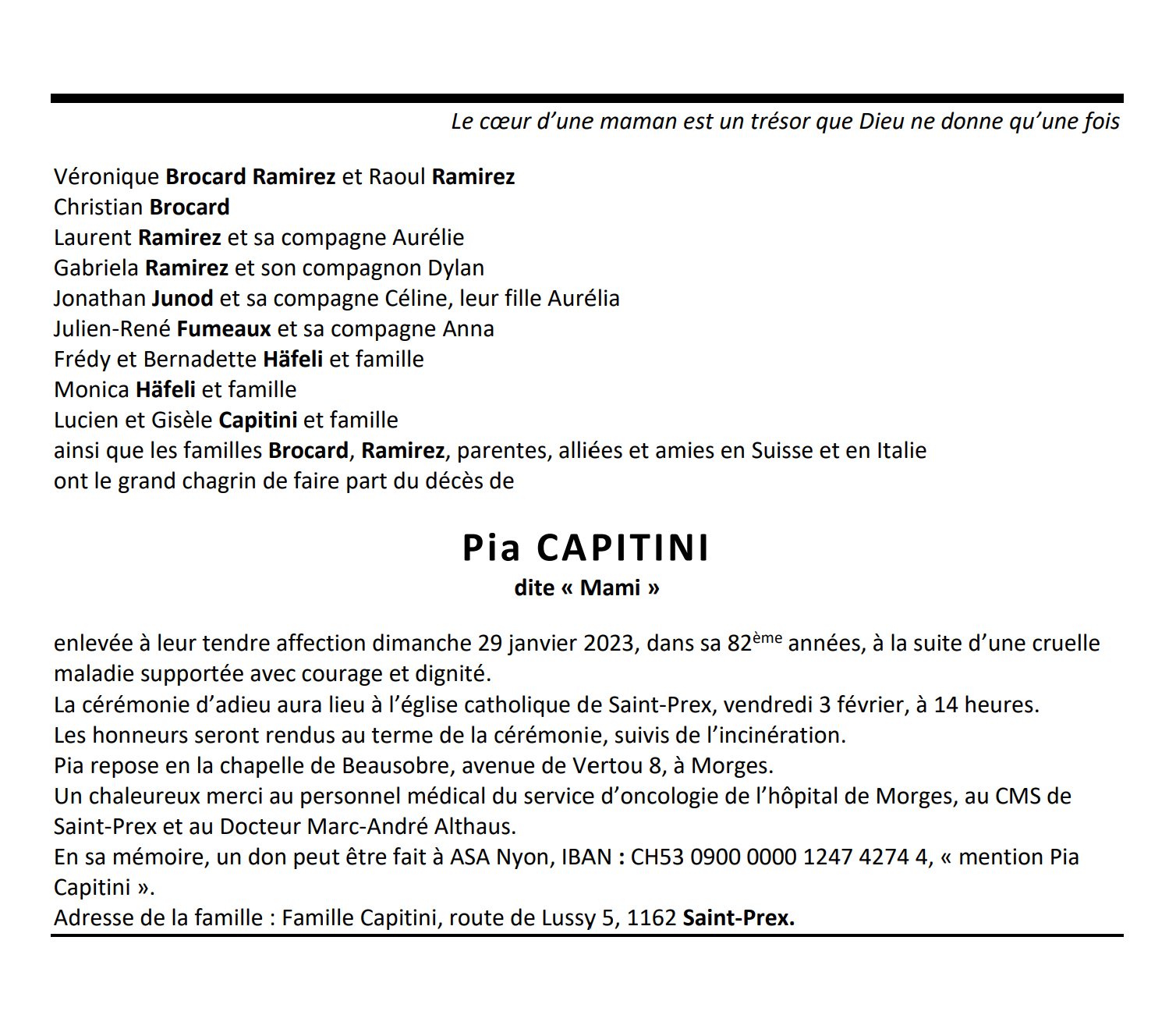 Pia CAPITINI 15 mar. 1941 - 29 jan. 2023 Avis mortuaire PFG Télecharger PDF Partager sur: Galerie PreviousNext PreviousNext