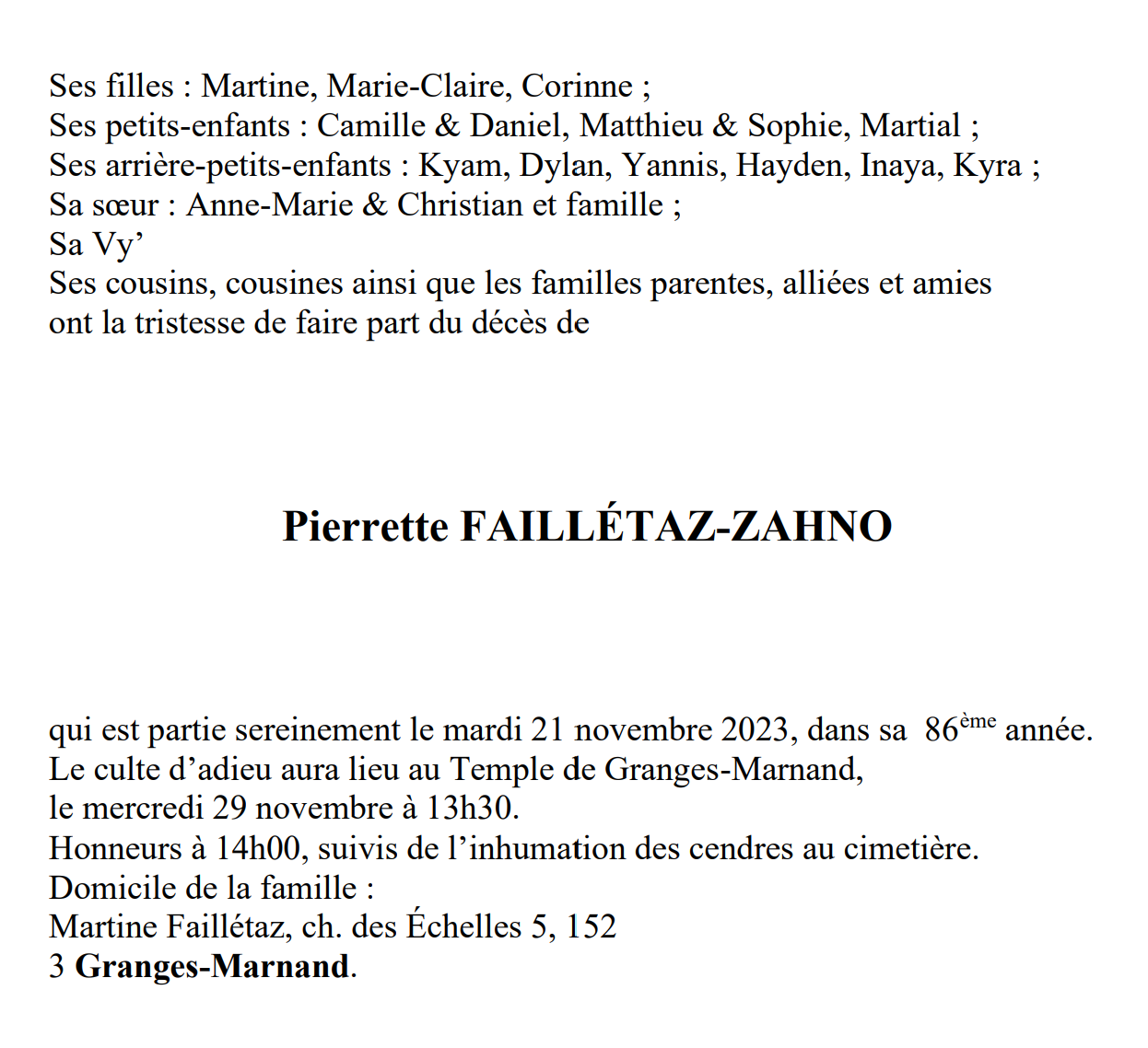 Pierrette FAILLÉTAZ-ZAHNO 11 fév. 1938 - 21 nov. 2023 Avis mortuaire PFG Télecharger PDF Partager sur: Galerie PreviousNext PreviousNext
