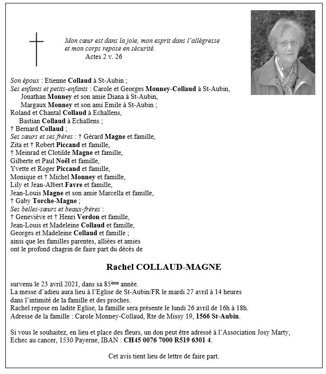 Rachel COLLAUD-MAGNE 10 aoû. 1936 - 23 avr. 2021 Avis mortuaire PFG Télecharger PDF Partager sur: Galerie PreviousNext PreviousNext