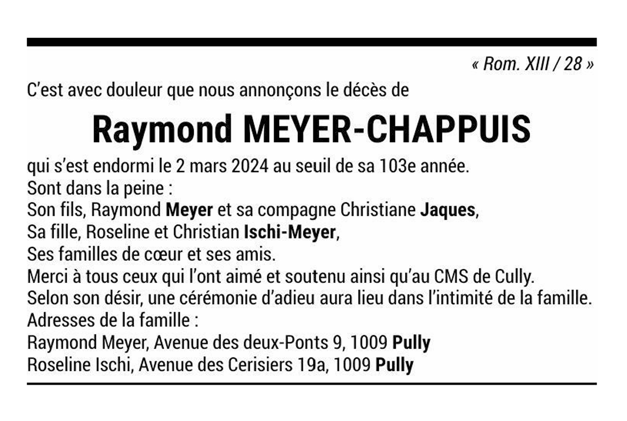 Raymond MEYER-CHAPPUIS 13 mar. 1921 - 02 mar. 2024 Avis mortuaire PFG Télecharger PDF Partager sur: Galerie