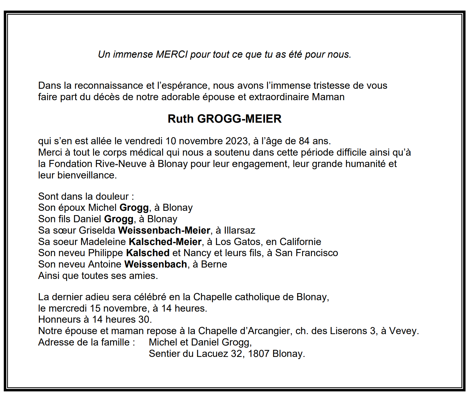 Ruth GROGG-MEIER 13 mar. 1939 - 10 nov. 2023 Avis mortuaire PFG Télecharger PDF Partager sur: Galerie PreviousNext PreviousNext