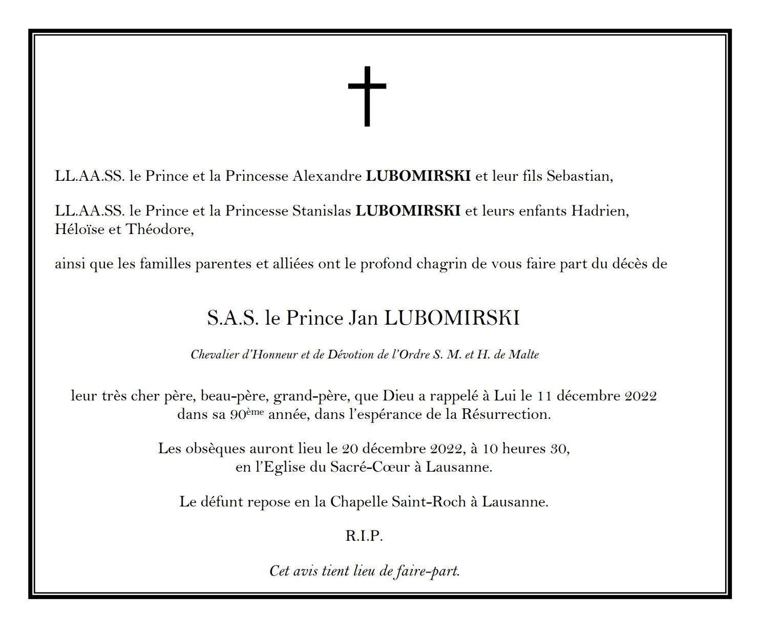 S.A.S. le Prince Jan LUBOMIRSKI 12 jan. 1933 - 11 déc. 2022 Avis mortuaire PFG Télecharger PDF Partager sur: Galerie PreviousNext PreviousNext